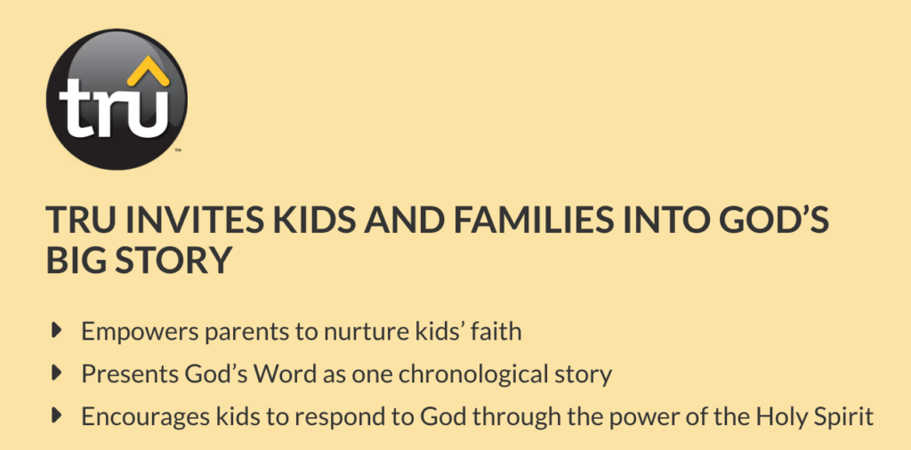 Tru is a digital, multi-age children’s curriculum that teaches the Bible chronologically, helping kids connect God’s story to their lives. Lessons include storytelling, songs, activities, memory verses, and family resources, making learning engaging both in class and at home.